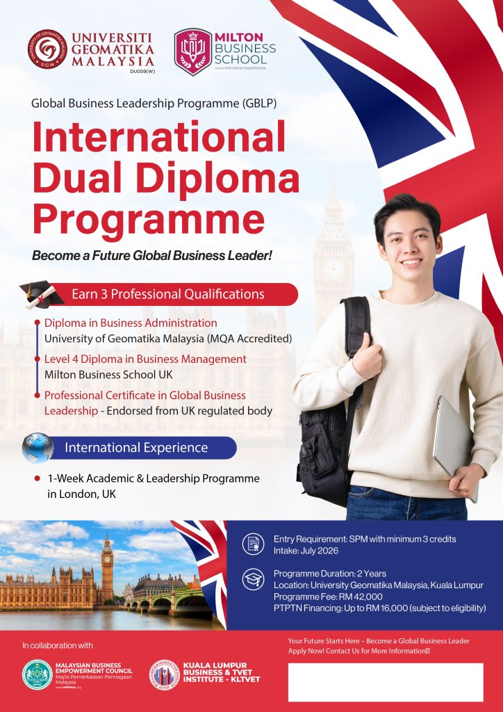 Emeritus Executive ProgrammeEmpowering today’s workforce for tomorrow’s challenges. Course ProgramINTERNATIONAL DUAL DIPLOMA PROGRAMME – University Geomatika Malaysia dan Milton Business School UK Maklumt Lanjut sila hubungi 010 505 1015 atau email ke [email protected]